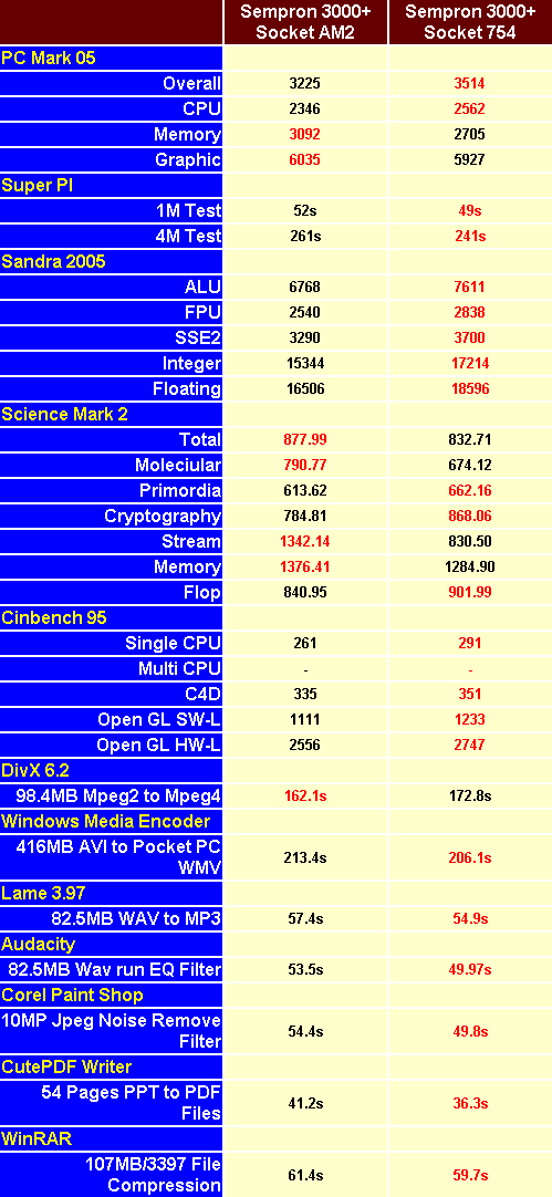 Sempron 3000+ AM2 медленее s754 26.05.2006 17:34 Android обсудить Ресурс HKEPC представил на своих страницах обзор AMD Sempron 3000+ рассчитанного на применение в платформах AM2. Представленные ниже результаты тестирования в комментариях не нуждаются: Процессор для AM2 на шаг позади. Медленее на 200MHz, но имеющий больший L2 кэш и основанный на ядре Manila c TDP равном 62W.