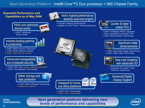 G965 будет единственным новым чипсетом обладающим интегрированным видеоядром нового поколения, рассчитанного на использование с Vista Premium. Также он будет поддерживать все Core 2 Duo CPU и память DDR-800. P965, в свою очередь, будет использовать более упрощенное графическое ядро.