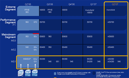 Обновленный roadmap также подтверждает существование Kentsfield, первого четырехядерного процессора Intel для применения в настольных системах. Kentsfield ,будет запущен как "Extreme" процессор в первом квартале 2007, но официального названия Intel пока не сообщает.