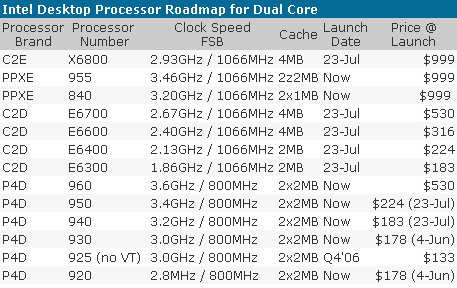 Процессоры Core 2 Duo появятся 23 июля, почти вместе с новым чипсетом 96x Broadwater. Согласно новому roadmap, процессоры Core 2 в первом квартале 2007 года составят около 35% от всех продаж Intel. Conroe, версия Core 2 для настольных систем, будет первым процессором от Intel с новым буквенно-цифровым обозначением. Флагман линейки, Core 2 Extereme, также появится 23 июля, и будет носить обозначение X6800.