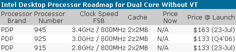Позже Intel выпустит Presler с отключенной технологией виртуализации, вместе с 945, 925 и 915 сериями.