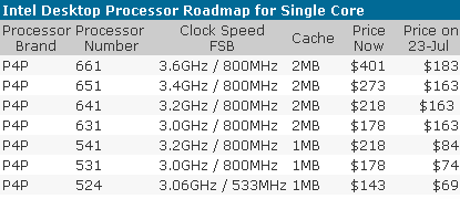 Intel опустит цены на декстоп-процессоры на протяжении года. На многие процессоры Pentium D произойдет снижение цен от $30 до 50%. На все Celeron'ы 300-ой серии в 4 квартале 2006 года будет установлена цена ниже $80.