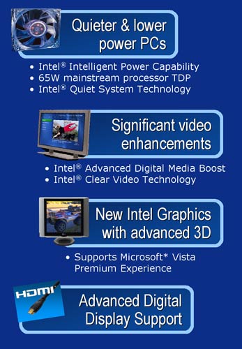 Intel также обещает поддержку HDMI, к тому же будет поддержка того, что Intel называет "Clear Video Technology" - технологии обработки видео от Intel. Судя по Viiv и наличию HDMI можно сделать вывод, что новое графическое ядро будет использоваться также для работы с форматами видео, используемыми HD-DVD и онлайновыми службами потокового видео.