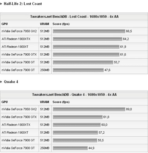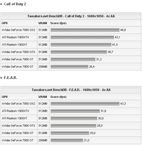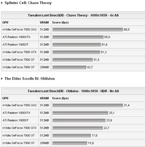 Ничего удивительного нет, 7950GX2 уверенно во всех тестах обходит 1900XTX. Но, тем не менее, последняя демонстрирует отличную производительность, как для одиночной видеокарты.