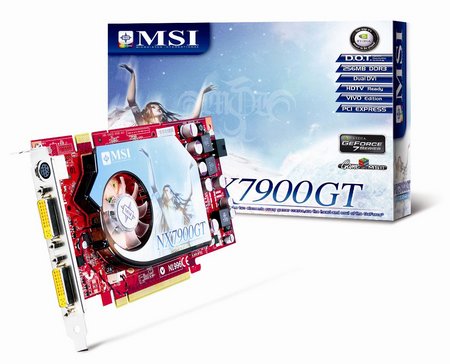 MSI NX7900GT-VT2D256E-HD оснащена HDCP-Key-ROM, точно также как и дорогущий GeForce 7950 GX2. Разумеется, NX7900GT-VT2D256E-HD базируется на чипе G71 и имеет 24 пиксельных конвейеров, а также 8 вертексных процессоров. Производитель кроме всего прочего еще и разогнал свой продукт. Графическое ядро работает на частоте 500 МГц (450 МГц стандарт), память 256 Мб GDDR3 с временем доступа 1,4 нс и частотой 765 МГц (660 МГц стандарт). Новинка оснащена двумя портами DVI.