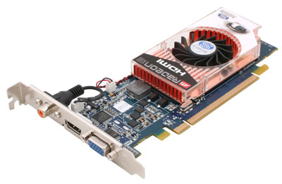 Итак, графический чип работает все же на 500 МГц, а не на 575 МГц как заявлялось раньше, память стандарта DDR3 осталась без изменений, и функционирует на 800 МГц. Видеокарта низкопрофильного форм-фактора идет с комплектом дополнительных планок и с DVI/HDMI переходником. Полноразмерная планка с разъемами VGA, HDMI и входом SP-DIF для подключения к звуковой карте установлена на самой видеокарте, остальные две – низкопрофильные, одна с полным набором разъемов, другая без SP-DIF.