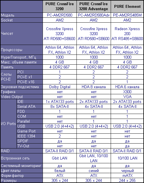 Высокоуровневую PURE CrossFire 3200 - PC-AM2RD580, бюджетную PURE CrossFire 3200 Advantage - PC-AM2RD580Adv и плату со встроенной графикой PURE Element - PE-AM2RS485M.