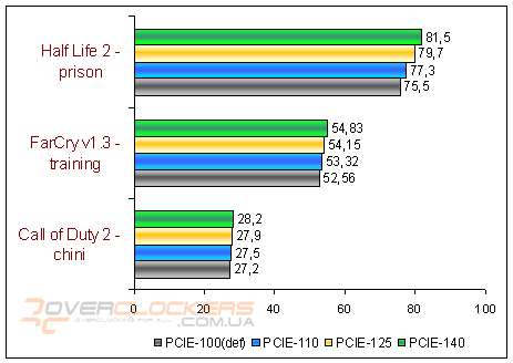 Итак, один из тестов был проведен в играх на двух видеокартах X1600 Pro в режиме CrossFire с процессором Core 2 Duo 1.866GHz (266х7). Частота шины PCI-E при этом увеличивалась со 100 МГц до 140 МГц.
