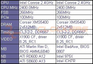 Далее было проведено сравнительное тестирование между ATI RD600 + SB600 и Intel 975X + ICH7R. Конфигурация тестовых систем приведена ниже: