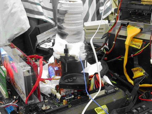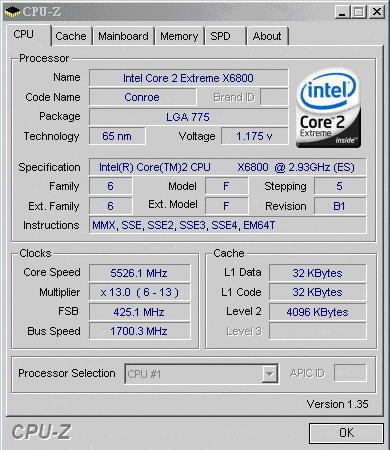 Система рекордсмена Intel D975XBX 302 mod, Core 2 Duo X6800, G.SKILL 2GBGA DDRII800 и блок питания Zippy 850 Вт. Процессор, благодаря применению жидкого азота, был разогнан до частоты 5526 МГц (для чего пришлось отключить одно ядро). Напряжение подаваемое на ядро пришлось поднять до 1,73 В, что очень много! Память работала в синхронном режиме с процессором с таймингами 3-3-3-1 и напряжением 2,4 В.