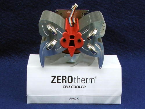 Итак, кулер массой 420 грамм, построен на основе тепловых трубок (кстати, Apack специализируется в данной области) имеющих вид петли, в количестве четырех штук. Эти "петли" пронизывают 102 алюминиевые пластины в форме бабочки, общей площадью почти 0,5 квадратных метров.