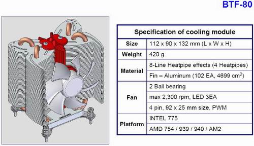 Вентилятор (на двух шарикоподшипниках) размером 92 мм может управлять оборотами при соответствующей поддержке со стороны материнской платы, а максимальная скорость вращения – 2300 об/мин. Из особенностей можно выделить красную подсветку, что понравится моддерам, и мордашку бабочки - а вот понравится ли это моддерам. :) Кулер APACK ZEROTHERM BTF80 совместим с Intel LGA775 и с AMD 754/939/940/AM2.