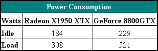 Делая выводы из полученных результатов измерения потребляемой мощности, DailyTech отмечает, что недавно опубликованные рекомендации NVIDIA об использовании 450-ваттного блок питания имеют под собой достаточные основания. С другой стороны, уровень потребления мощности NVIDIA’s GeForce 8800GTX не столь плох, как это ожидалось. Как видно из результатов, в "холостом" режиме 8800GTX потребляет на 24% больше, чем оппонент. Под нагрузкой эта разница уменьшается до 4%. Учитывая разницу в производительности, ускоритель от NVIDIA ни чуть не хуже Radeon X1950 XTX в соотношении производительности к потребляемой мощности.