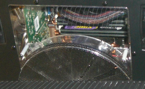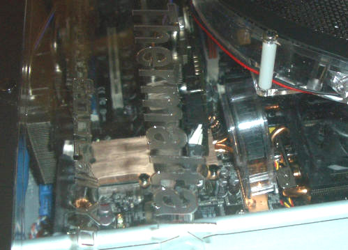В свою очередь, теплопроводные трубки подводятся к большому медному радиатору с кулером, расположенному между первой видеокартой и одним из процессоров – в общем, система не испытывает недостатка в охлаждении и может обеспечить хороший оверклокинг. В этом автора статьи также убедил киловатный блок питания (всего на всего – прим.ред.)