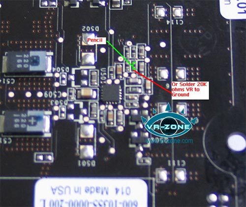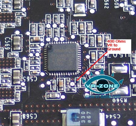Во-первых, необходимо найти, как показано ниже на фотографии, регулятор напряжения процессора Primarion PX3540 и впаять переменный резистор от 400-500 Ом, одну ножку соединив с "землей" и установив максимальное сопротивление. При понижении сопротивления на этом резисторе будет подниматься напряжение ядра.