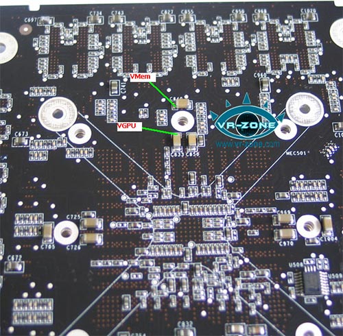 Где измерить напряжения ядра и памяти вам подскажет вот это фото:
