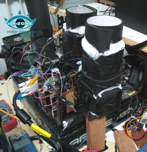 Вся эта конструкция запускалась товарищем Shamino в составе такой же volt-modded материнской платы NForce 680i SLI от EVGA и с процессором QX6700 разогнанным до частоты 4,5 ГГц, фотографии которых вы уже видели.