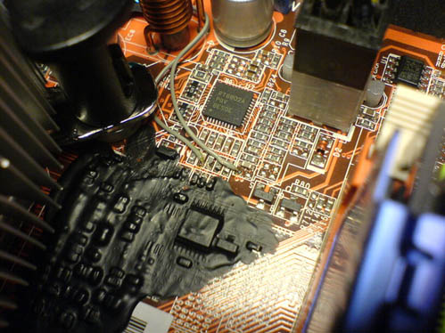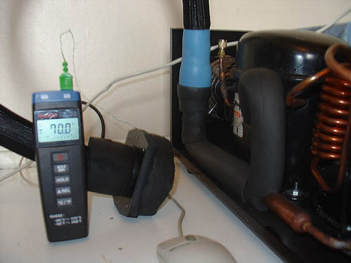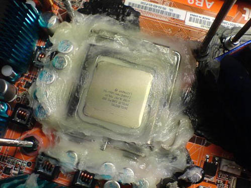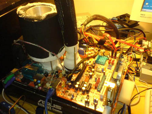 Охлаждение северного моста осуществлялось устройством конструкции еще одного экстремала под названием Benchbox SS by Johann на основе компрессора Electrolux MP14FB и хладагента R402A. С учетом вольтмоддинга северного моста (1.83В) температура чипа составляла –63С.
