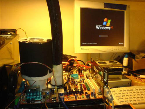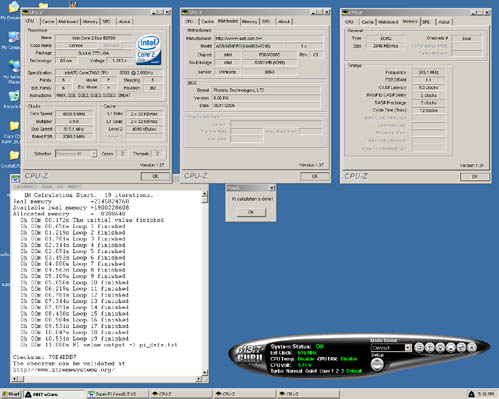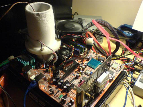 Охлаждение CPU производилось посредством алюминиевого контейнера MMouse Alu pot Rev 3 (наверняка запатентован – прим.ред), сухого льда и ацетона; температура при выключенном стенде составляла –72С, включенная система без нагрузки подняла температуру до -63С, с нагрузкой – до –60С. Напряжение питания ядра - 1.74В. Напряжение памяти было доведено до 2.6 вольт.