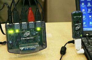Так или иначе, но Belkin Cable-Free USB Hub использует ту же технологию UWB, что и Y-Е Data YD-300, поддерживает протокол USB 2.0 (480 Mбит/с), оснащен четырьмя портами и работает на расстоянии до 9 метров. Ориентировочная стоимость устройства 200$.