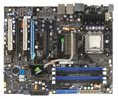 Материнская плата ECS PN2 SLI2+ позиционируется для геймеров и энтузиастов, основана на NVIDIA nForce 680i SLI, поддерживает процессоры с FSB 1333 МГц и память вплоть до DDR2 800. На ней установлено целых три разъема PCI-E x16 (один – в режиме х8), два PCI-E x1, два PCI, один канал IDE, шесть каналов SATA-300 (два горизонтальных разъема), HD Audio (Realtek ALC885), FireWire и два сетевых адаптера Gigabit Fast Ethernet на чипах Marvell 88E1116. Схема питания процессора шестифазная, система охлаждения полностью пассивная и установлена также на MOSFET. Ну а для любителей разгона не лишним будет наличие POST-индикатора.