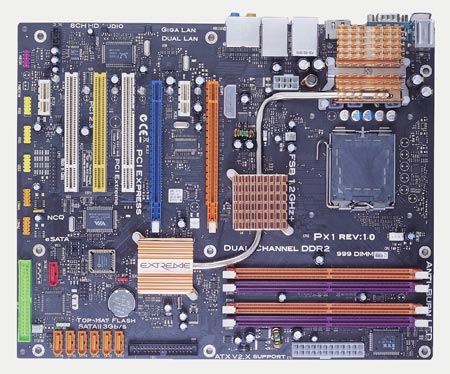 ECS PX1, по заявлению компании Elitegroup, тихое и мощное решение для развлечений, построено на базе связки Intel P965 и ICH8DH, и поддерживает технологию Intel Viiv. Плата рассчитана на процессоры с FSB 1066МГц, память DDR2 800 и позволяет устанавливать видеокарты ATI в режиме CrossFire (один слот PCI-E работает в режиме x16, второй - в режиме x4). Для расширения возможностей на плате установлено семь каналов SATA-300, один канал eSATA-300, один канал IDE, аудиокодек Realtek ALC885, два сетевых адаптера Gigabit (Intel 82566DC и Realtek RTL8110S), а также FireWire (чип VIA VT6308P). Система охлаждения пассивная, как на чипах, так и на силовой обвязке и объединена в единое целое при помощи тепловой трубки.