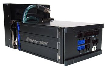 Система охлаждения имеет модульную схему: помпа, размерами 172 х 141 х 105 мм, вынесена отдельным блоком, что позволяет установить PSU-1200ATX-12S в любой корпус стандарта ATX, E-ATX и BTX. Помимо этого, в сам блок питания встроен дополнительный 120-мм кулер с голубой подсветкой, который создает шум от 25 до 33 Дб. За обеспечение компьютерных комплектующих таким количеством энергии придется отдать $499.99.