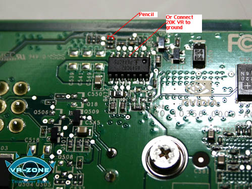 Повышение напряжения питания памяти возможно либо карандашом либо переменным резистором в 20 кОм, как указано на следующем фото (вторая ножка резистора припаивается на «землю»). Резистор установить на максимальное сопротивление и плавным понижением последнего увеличить напряжение. Оригинальный резистор имеет сопротивление в 538 Ом, понижение сопротивления на 10 Ом поднимает напряжение на 0,05 вольт.