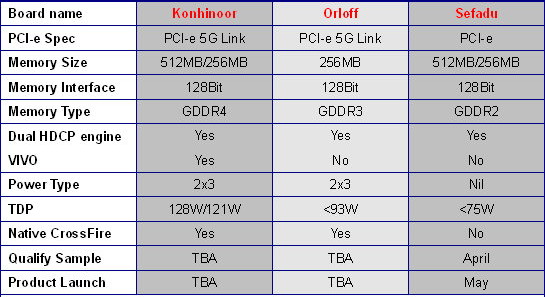 Сайт HKE PC, со ссылкой на приближенные к AMD источники, сообщил, что появление на розничном рынке видеокарт среднего ценового диапазона должно состояться в мае. Они будут представлены несколькими модификациями под кодовыми названиями Kohinoor, Orloff и Sefadu. Основным отличием станет поддерживаемый тип памяти: Kohinoor снабдят GDDR4, Orloff – GDDR3, а наиболее дешевый вариант будет довольствоваться GDDR2-памятью. Причем Kohinoor и Orloff будут иметь поддержку шину PCI Express версии 2.0, благодаря которой через 16 линий будет передаваться до 8 Гб/с информации.