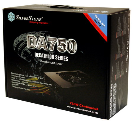 Модель SST-DA750 имеет мощность 750 Вт и позиционируется в роли решения для энтузиастов, желающих собрать многоядерную систему. В ней используется модульная система подключения кабелей из которых в комплекте присутствуют: 24/20-контактный для питания материнской платы, 8-контактный EPS12V кабель, 4-контактный ATX12V, восьми- и два двойных 6-контактных кабеля для подключения PCI-E устройств, а также набор для SATA, IDE и флоппи-дисковода.