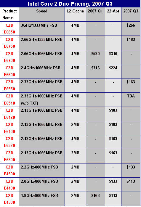 Интересен тот факт, что прослеживается сильная тенденция снижения цен на процессоры Core 2 Duo E6х50, по сравнению с ценами версий с частой шины FSB 1066 МГц. Intel отмечает, что Core 2 Duo E6400/E6420, E6300/E6320 будут стоять на рынке $183, $163, но если цены на остальное семейство E6000 также снизятся, то это приведет к огромному снижению прибыли, которую ожидается получить от продаж Core 2 Duo E4000. По словам аналитиков, это вряд ли будет в ближайшем будущем, так как семейство Core 2 Duo E6х50 будет ожидать выхода материнских плат, которые смогут поддерживать частоту шины FSB в 1333 МГц.