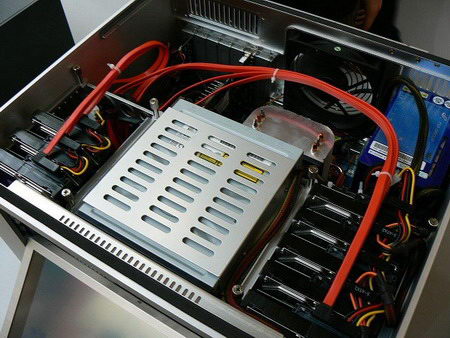 Внутри шасси имеет очень много свободного пространства, которого, со слов сотрудников компании, хватит для размещения десяти жестких дисков, блока питания ATX и видеокарты с массивной системой охлаждения. Для отвода тепла есть предустановленный на задней панели 120-мм вентилятор, работающий на выдув, и два 90-миллиметровых, втягивающих воздух внутрь.