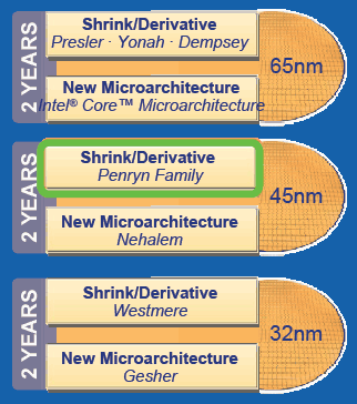 Созданные в рамках 45 нм техпроцесса новые процессоры, как ожидается, будут более производительными и с меньшим энергопотреблением, благодаря тому, что для создания транзисторов используется диэлектрик с высоким значением k на основе гафния – high-k, а также металлический затвор. Также будет использоваться в процессорах с кодовым названием Penryn новый метод выполнения деления, получившего название Radix 16, что примерно вдвое обеспечит ускорение работы делителя. Для повышения скорости работы с данными мультимедиа заявлена поддержка новых инструкций Streaming SIMD Extensions – SSE 4. Кроме этого будет увеличен объем кэш-памяти второго уровня до 50% по сравнению с нынешним поколением Core 2, и в двухъядерных процессорах Penryn он будет достигать 6 Мб, а в четырехъядерных – 12 Мб. Четырехъядерные процессоры будут содержать более 820 млн. транзисторов, площадь двухъядерного Penryn будет равна всего 107 кв. мм, что на 25% меньше чем у 65 нм Conroe.