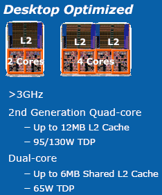Тактовые частоты процессоров на новом ядре для настольного сегмента будут выше 3 ГГц, при этом уровень DTP для двухъядерных процессоров не превысит 65 Вт, для четырехъядерных – 95-130 Вт.