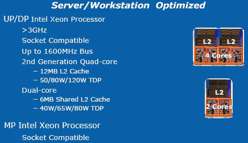 В серверном сегменте процессоры Xeon смогут получить поддержку FSB1600, размеры кэш-памяти останутся на том же уровне, что и в десктопных процессорах, а уровень энергопотребления будет равен 40/65/80 Вт для двухъядерных и 50/80/120 Вт для четырехъядерных процессоров в зависимости от модели.