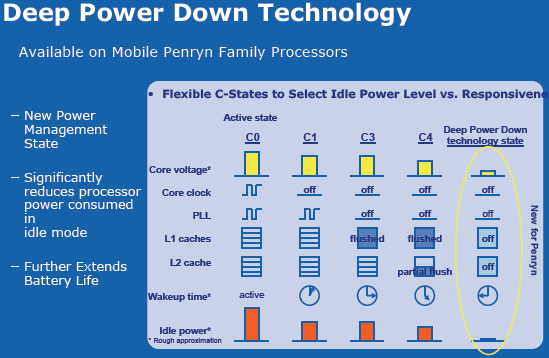 Мобильные процессоры на ядре Penryn будут состоять из двухъядерных моделей с 6 Мб кэш-памяти второго уровня и с частотами до 3 ГГц. Для снижения энергопотребления новые процессоры будут использовать технологии Deep Power Down и Dynamic Acceleration Technology. Энергосберегающая технология Deep Power Down позволяет существенно снизить энергопотребление процессора в моменты его простоя за счет снижения влияния токов утечки внутри транзисторов.