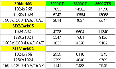 Первое, на что хотелось бы обратить внимание, так это на количество очков набранных видеокартой GeForce 8600 GT в 3DMark2006 с разрешением 1024х768 – в отличие от ранее полученных результатов, здесь наблюдается рост на 200 попугаев. Возможно это из-за того, что ядро карты работало на частоте 600 МГц, а не на 540 МГц, как это было известно вначале марта. Бюджетная модель GeForce 8500 GT работала на частоте 450/800 МГц, что немного отличается от недавно опубликованной информации. Т.е. ближе ко дню анонса характеристики видеоадаптеров NVidia поддерживающие DirectX 10 все больше и больше проясняются, а может, и наоборот, вводят людей в заблуждение. Как бы то ни было, точные данные мы узнаем лишь в день анонса той или иной видеокарты.