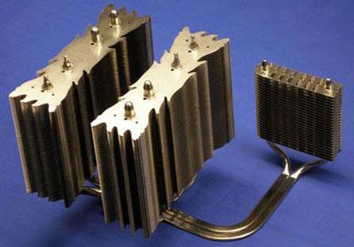 Он представляет собой двухбашенную конструкцию на четырех U-образных тепловых трубках диаметром 8мм. Thermalright не стала «изобретать велосипед» и основания кулера сделала из двух медных частей, между которыми и размещаются трубки. Так как длина кулера 14.6 см, ширина 12.2 см а, высота 16 см – его можно назвать одним из самых габаритных кулеров на рынке, но при этом вес остается в разумных пределах, а именно 790 грамм. Особую изюминку продукту придают выполненные в виде огня, алюминиевые пластины радиатора, которых по 56 на каждой стороне. Цена retail-версии будет установлена на отметке 79.95$, что является несколько дороже конкурентов в лице топовых Scythе. И, в отличие от последних, производитель не похлопотался укомплектовать кулер вентилятором. Возможно, это было сделано для уменьшения конечной стоимости или для того, чтоб сделать его более универсальным, ведь у каждого свои приоритеты: бесшумность для моддеров, производительность для оверклокеров – каждый из них сможет приобрести наиболее подходящий для них вариант.
