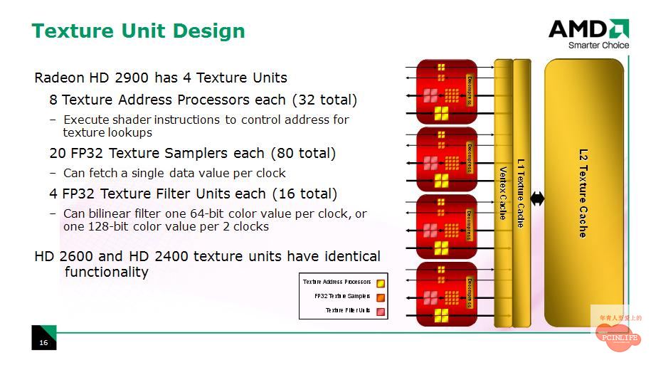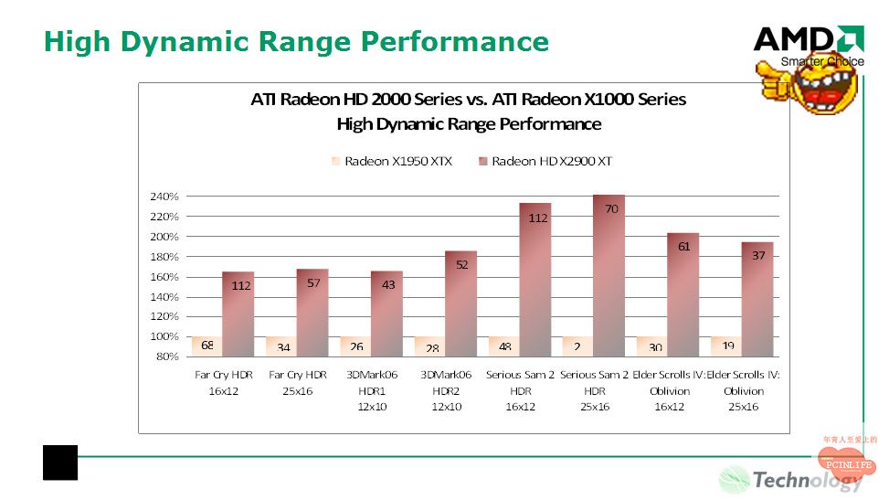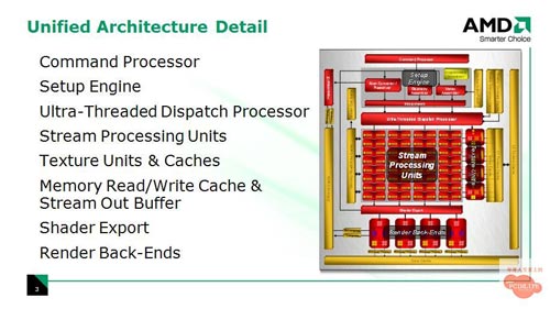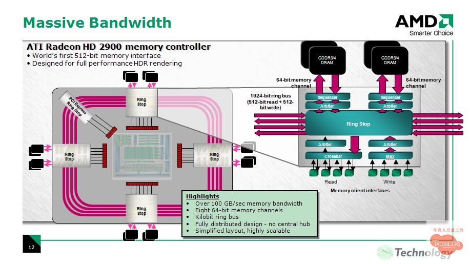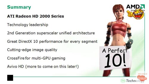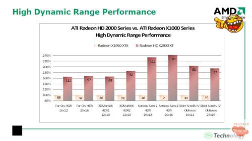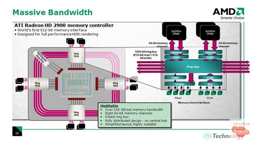 На них подробно показано некоторые революционные нововведения присущие HD 2900 XT, такие как огромная пропускная способность видеопамяти, SIMD подготовка (выполнение одинаковой инструкции применимых к множеству данных) и принцип нового метода сглаживания CFAA (Custom Filter Anti-Aliasing), который якобы превосходит CSAA от NVIDIA. Также подробно показано схематически архитектуру ядра. Переписывать все составляющие нет смыла – это нужно увидеть.