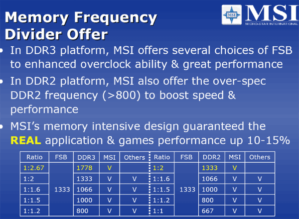 сообщают, что материнская плата Microstar Diamond MS-7356 (Intel P35 "Bearlake") может обеспечить разгон оперативной памяти стандарта DDR3 до впечатляющих 1778 МГц, хотя официально поддерживает лишь модули DDR3-1333. Подобный результат был достигнут при установке делителя 1:2.67 (CPU:Memory). Как доказательство приводится слайд (видимо, с презентации компании Microstar International), на котором и запечатлен подобный результат.