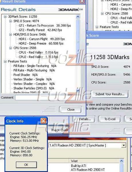 fudzilla.com референсная видеокарта HD 2900 XT была разогнана до стабильных 840 МГц по ядру и 1716 МГц по памяти, что в сочетании с процессором Intel Core 2 Duo E6700, дало возможность получить 11,258 в 3Dmark06.