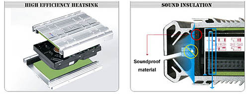 Уникальный дизайн сего устройства составляют алюминиевый корпус радиатора с дополнительным высокотеплопроводящим и виброизолирующим материалом на его внутренней поверхности. Также присутствует решение по снижению шума. Утверждается, что все эти особенности данного устройства в высшей степени эффективны.