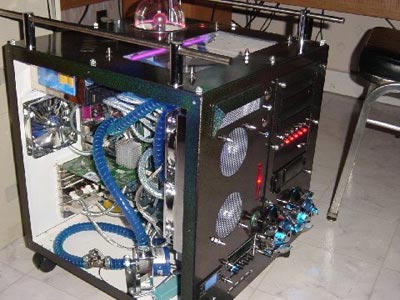 Как видим, основой для шасси послужил куб, изготовленный из алюминия. На одной из боковых панелей по всему периметру вырезано огромное окно, которое открывает вид на "внутренности" системы. На передней панели корпуса, помимо двух 12-см вентиляторов, разместилась небольшая информационная ЖК-панель и несколько тумблеров.