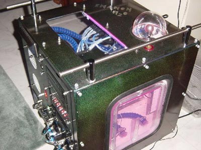 В верхней части также вырезано небольшое окошко, а по бокам установлены декоративные хромированные ручки, которые можно использовать для переноски увесистого корпуса. Изюминкой всего проекта является плазменный шар, который автор решил разместить сверху.