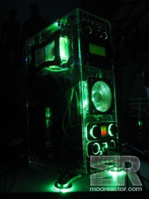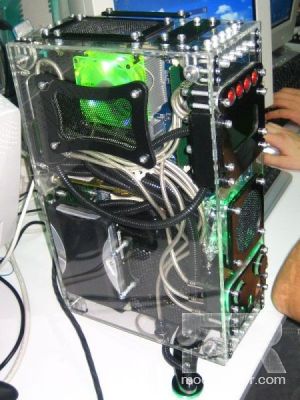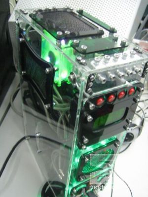 Благодаря специальной конструкции креплений комплектующих кажется, что каждый элемент внутри системы как бы парит в воздухе. На передней панели можно обнаружить 12-см вентилятор с яркой зеленой подсветкой, реобас и небольшой ЖК-дисплей.