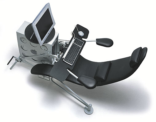 Netsurfer, как мы видим на снимке, является комбинацией стола и стула; изогнутая форма, а также расположение монитора на уровне глаз должны обеспечивать комфорт при длительной игре или работе за компьютером. Кроме того, у Netsurfer есть регулируемые по высоте подушки, поддерживающие шею и спину. Для поддержки рук и ног предназначены регулируемые подставки. Стоит такое удовольствие ни много, ни мало 3200 евро.