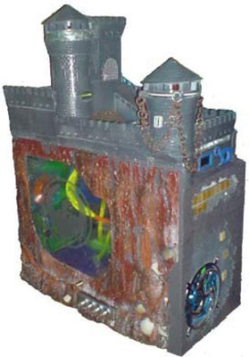 В начале кейс пришлось разобрать и модифицировать верхнюю часть корпуса, что в дальнейшем послужит основой для декоративных башенок. Далее Kosse удалось поместить в башенки вентилятор, 2 неонки, cart-reader, usb-порт, а одну из них еще и оборудовать под стакан для ручек. На передней панели в низу установлен 12-см вентилятор и своеобразный гриль. Боковая крышка также подверглась модификации, теперь она имеет полукруглую форму и прикреплена на фигурные петли. Стоит отметить, что для придания большего эффекта передняя панель сделана из гнутого крашеного оргстекла, а поверх наложен каркас с "каменной кладкой". Заключительным шагом была покраска всего корпуса разноцветными красками из баллончика.