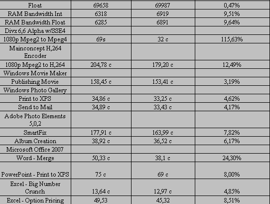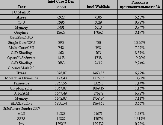 В принципе, результаты тестов можно и спрогнозировать, учитывая, что Wolfdale имеет 6 Мб кэш-прамяти L2 и поддерживает новый набор инструкций SSE4 (4 Мб L2 и SSE3 у Core 2 Duo E6550). Но, обратимся к сводной таблице с результатами тестирования.