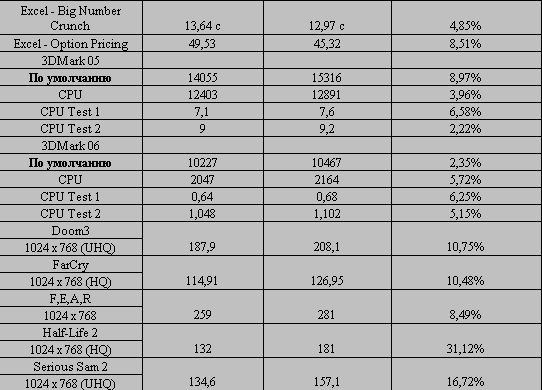 Новый процессор выигрывает в PC Mark около 5,5% производительности, в офисных приложениях выигрыш достигает 8%, в играх Doom 3 и Far Cry - 11%. Больше всего радует результат тестирования в Half-Life 2, где выигрыш составил примерно 30%.