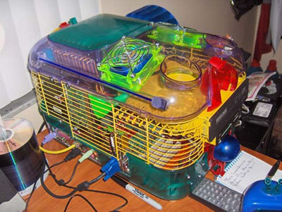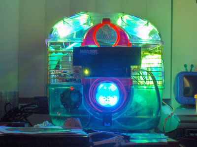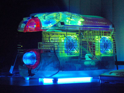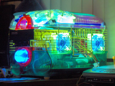 Основной акцент моддер сделал на подсветку и покраску «корпуса». Для этого внутренняя поверхность и привод были выкрашены в сочный желтый цвет, а в нижней части и на верхней крышке автор разместил по две неоновые лампы синего света. По бокам расположились 8-см светящиеся вентиляторы.